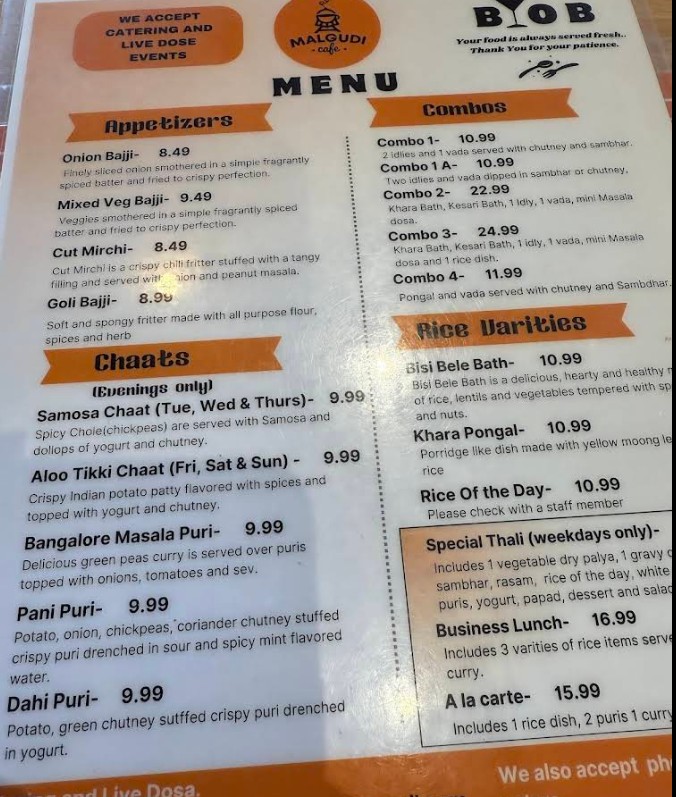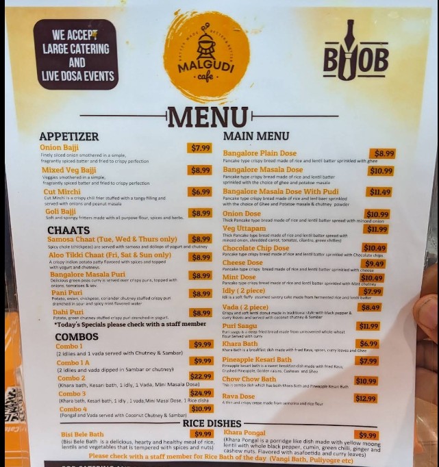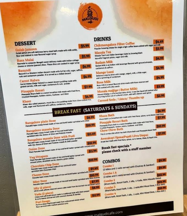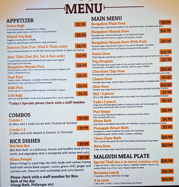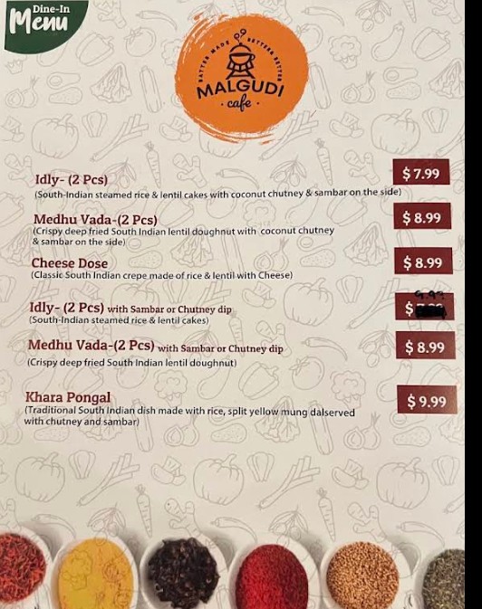 Looking for the complete Malgudi Cafe Restaurant menu with updated prices and authentic Indian flavors? Malgudi Cafe Restaurant offers a rich variety of traditional and modern Indian dishes, crafted with fresh ingredients and bold spices. From flavorful curries and aromatic biryanis to delicious street-style snacks and desserts, there’s something for everyone. Whether you're dining in, ordering takeout, or planning your next visit, this menu guide helps you explore the best dishes Malgudi Cafe Restaurant has to offer.